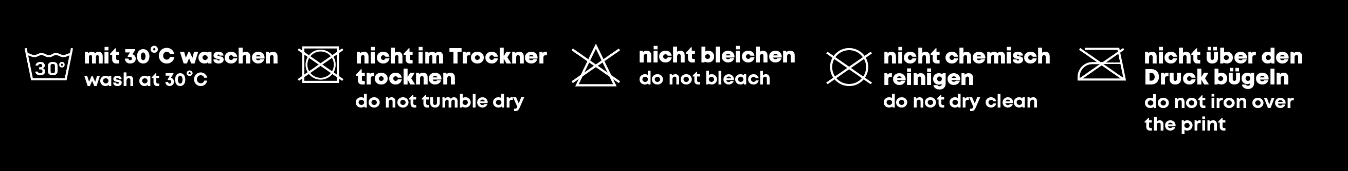 Die ursprünglich eingenähte Waschanleitung des Textils ist durch unsere Veredelung nicht mehr gültig. Bitte halte dich ausschließlich an diese Hinweise.